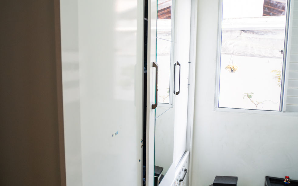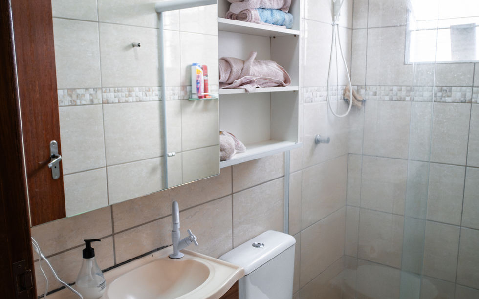 Banheiros com ventilação natural, box de vidro e revestimentos até o teto.